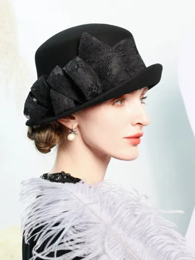 Women's Classic Winter 100% Wool Bowler Hat Ribbons Special Occasion Cocktail Cloche Hats